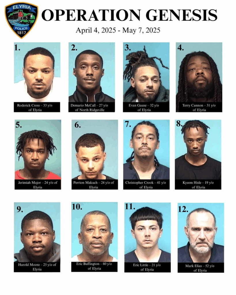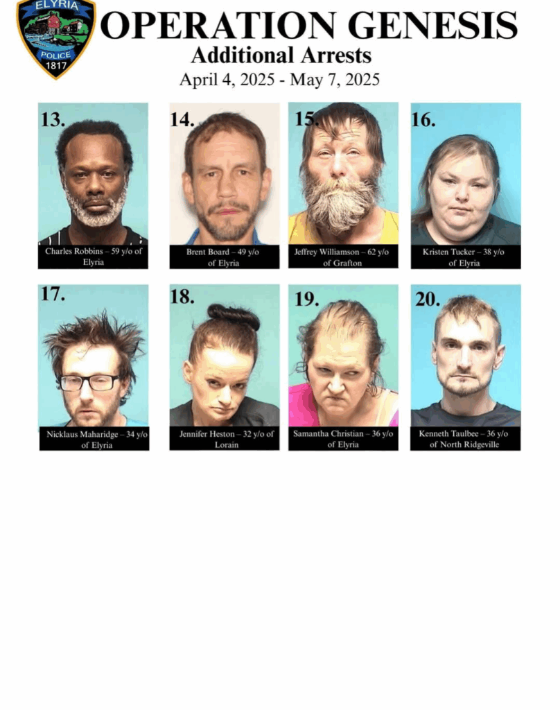 ELYRIA, OH — May 9, 2025 — The Elyria Police Department announced the successful conclusion of Operation Genesis, a multi-week narcotics enforcement initiative that led to the arrest of 20 individuals and the seizure of significant quantities of illegal drugs and firearms.