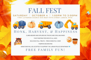 Families looking for autumn fun this weekend can head to downtown Lorain for First Lutheran Church’s Fall Fest, happening Saturday, October 4, from 1 to 3 p.m. at 1019 West Fifth Street. The free, family-friendly event will feature a “Touch-a-Truck” experience where children can climb aboard and explore big trucks … Continue reading Fall Fest Brings Family Fun to Downtown Lorain