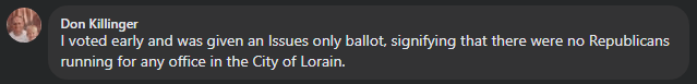 Local resident Don Killinger shared a similar experience, saying, “I voted early and was given an issues-only ballot, signifying that there were no Republicans running for any office in the City of Lorain.”