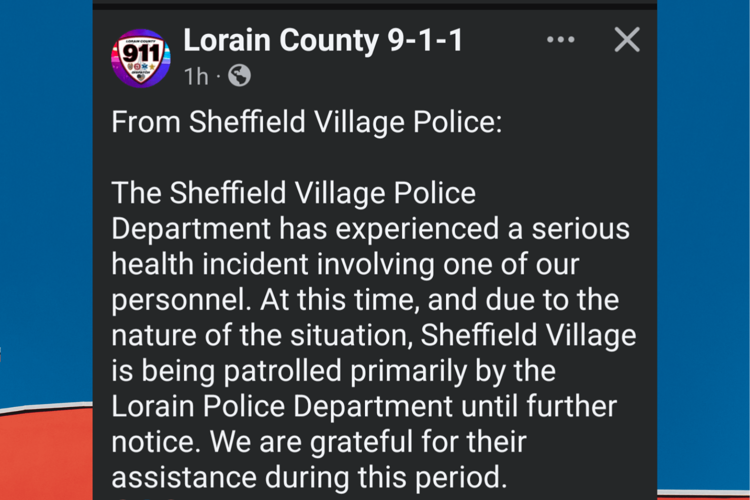 According to a Facebook post shared by Lorain County 9-1-1, the Sheffield Village Police Department reported a serious medical incident involving one of its personnel. Because of the situation and its impact on staffing, the department stated that patrol coverage in Sheffield Village is currently being handled primarily by the Lorain Police Department.